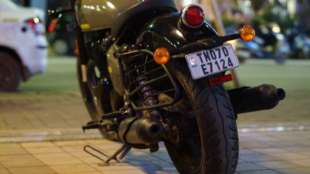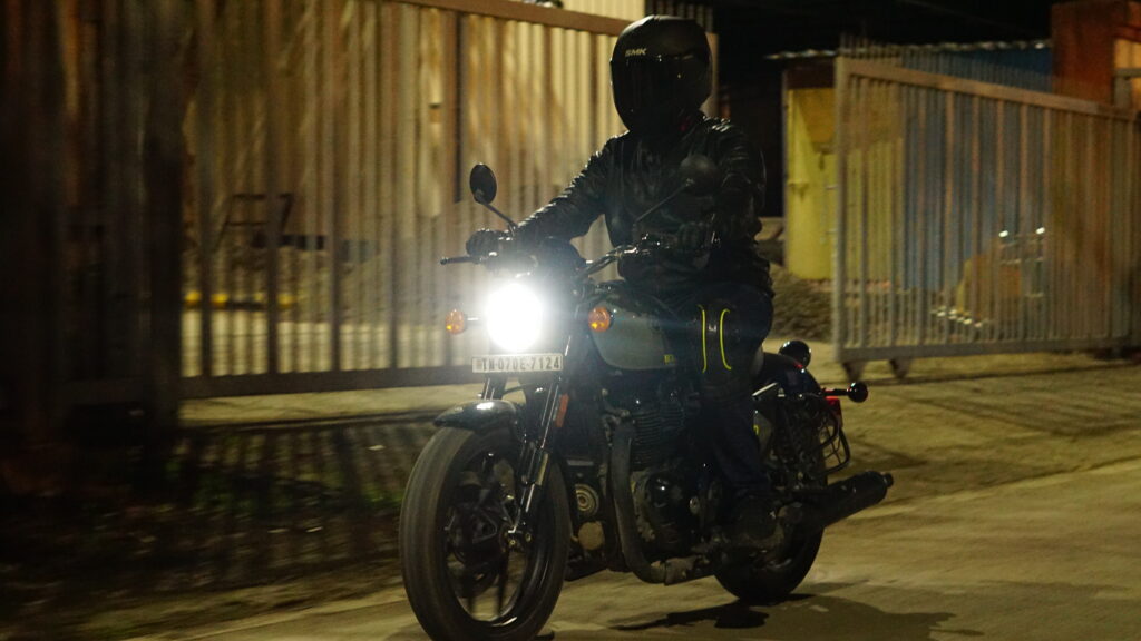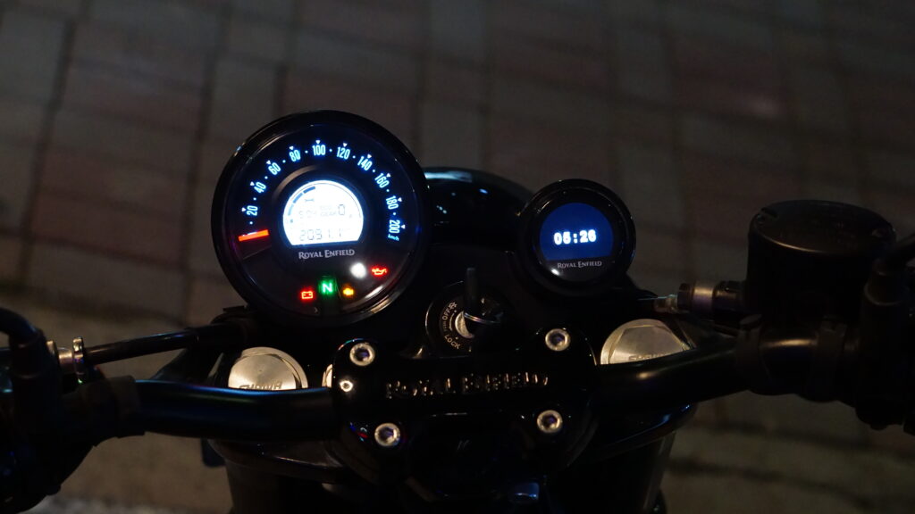 Ergonomics demands adjustment. The mid-set pegs and low, forward bars create a semi- aggressive posture. Coming from the laid-back Classic, I felt stretched initially, but the stance grew purposeful. At 795 mm, the seat height is approachable, though its width and weight make tight turns tricky at first. The single-seat setup cements its solo rider identity no pillion luxuries here.