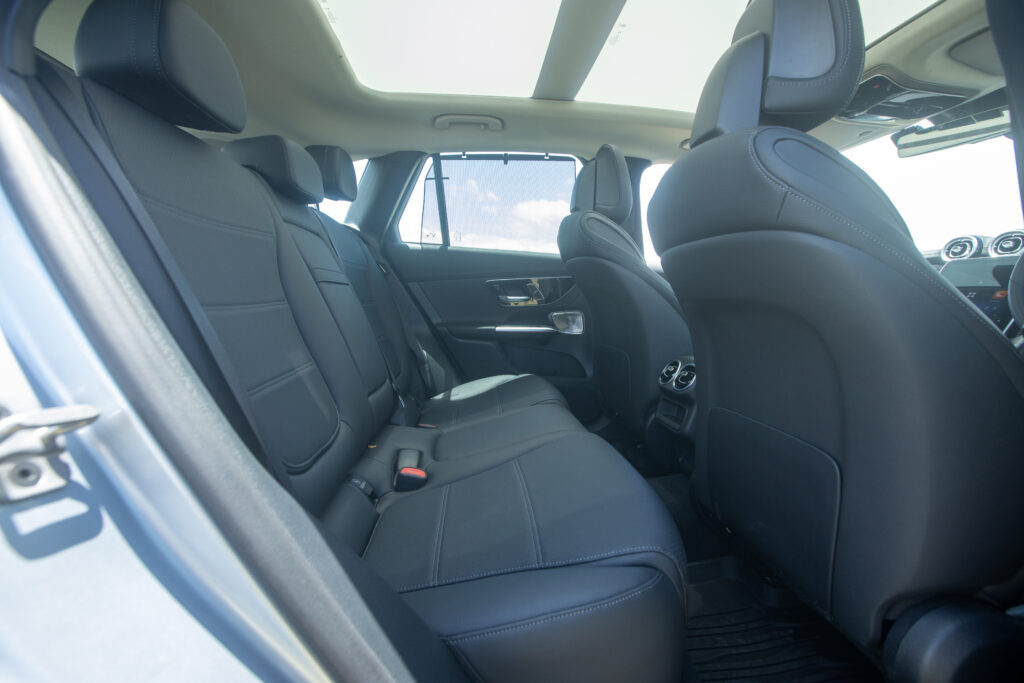 Rear seat comfort is excellent for four adults, with ample knee room and support. Five can fit, but the GLC is at its best with four occupants enjoying space and comfort.
