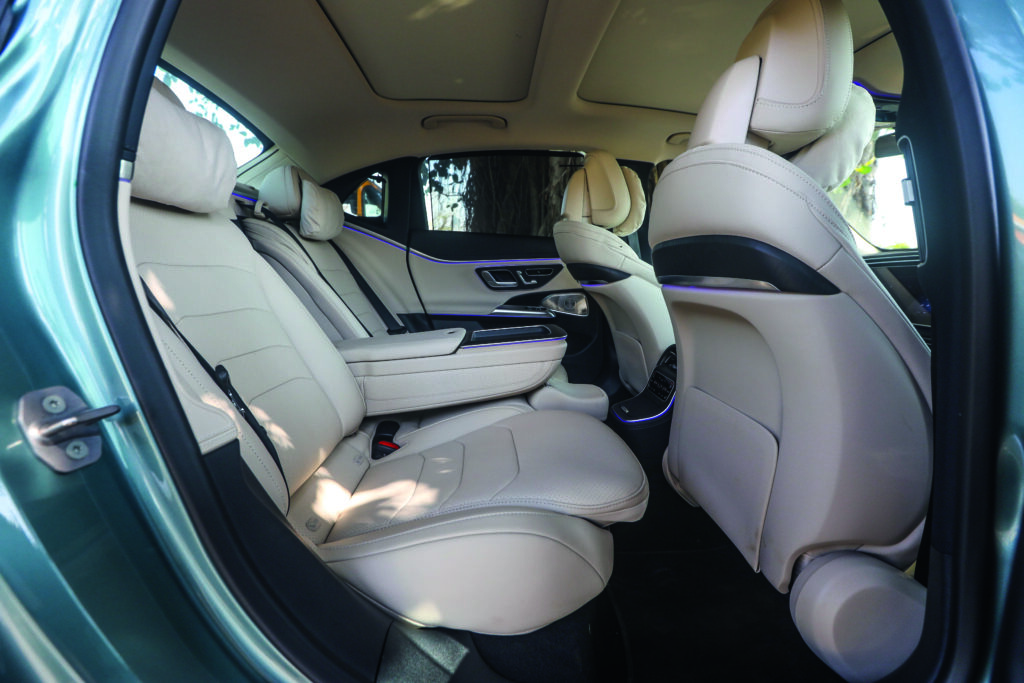 The rear seat, however, remains the true highlight. Few cars in this segment deliver such generous recline, legroom and headrest comfort. With the sunblinds raised and the panoramic roof lettingin a muted glow, the E 220d turns the rear bench into a space more aligned with private lounge travel than urban commuting.