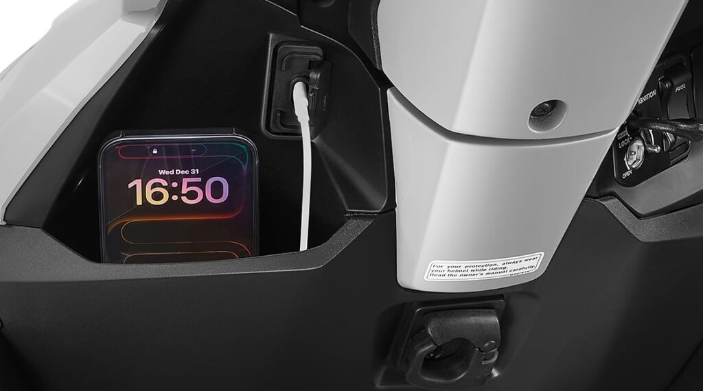 The front glove box comes with a USB Type-C charging port, allowing riders to charge their phones while travelling.