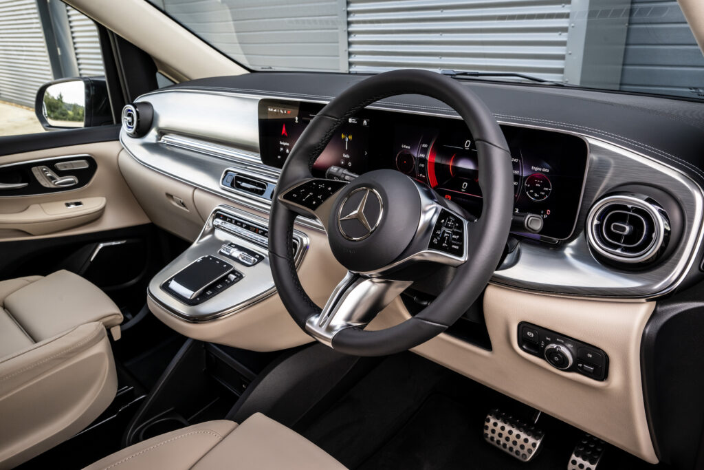 The V-Class comes equipped with dual 12.3-inch digital displays for infotainment and instrumentation. Physical buttons, touch controls, and a multifunction steering wheel ensure ease of use. The dashboard blends modern technology with traditional usability, making driving comfortable and intuitive.