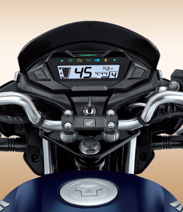 The motorcycle features a fully digital instrument cluster, displaying speed, fuel level, gear position, trip meters, and service reminders. The layout is clean and easy to read, helping riders stay informed without distraction.