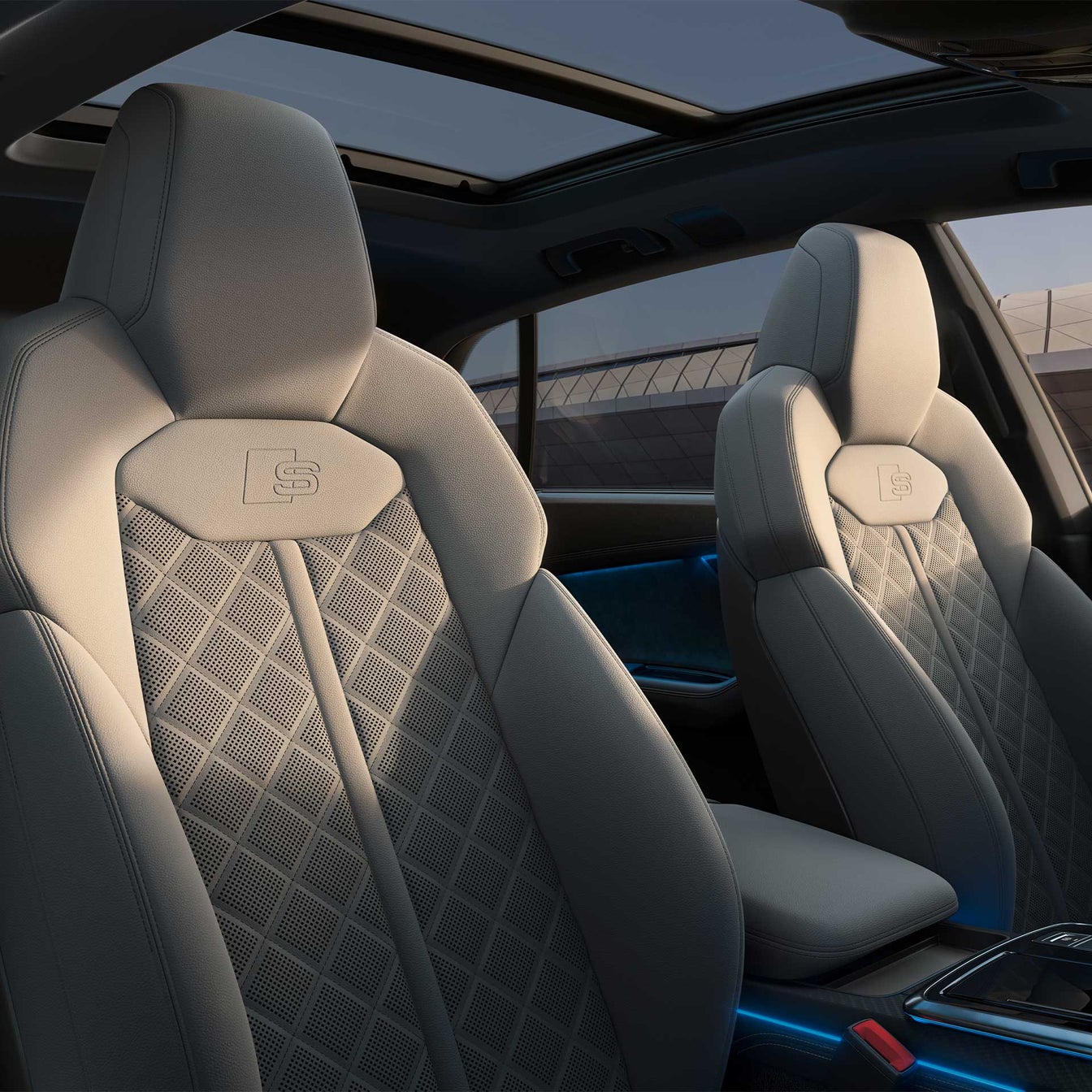 The steering wheel features S-line specific inserts, while the digital instrument cluster known as Virtual Cockpit Plus displays S-line performance graphics. Key comfort features include a panoramic sunroof, ambient lighting, multi zone climate control, and electrically adjustable front seats with heating, ventilation, and massage functions.