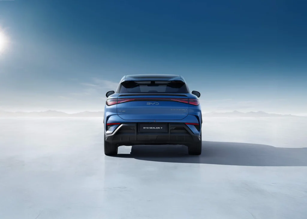 Rear view of the BYD Sealion 7 showcasing sleek LED lighting and futuristic design against a minimal landscape.