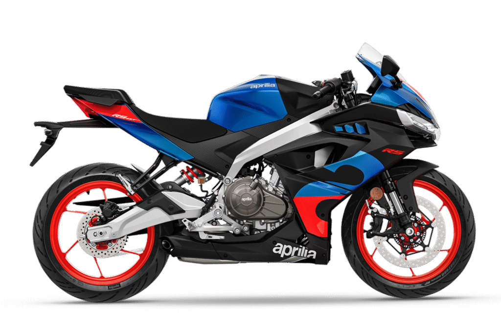 Apart from the black GP Replica, Aprilia also offers a striking blue color option. This version combines blue bodywork with black panels and red alloy wheels, creating a vibrant and youthful design.